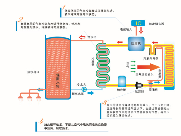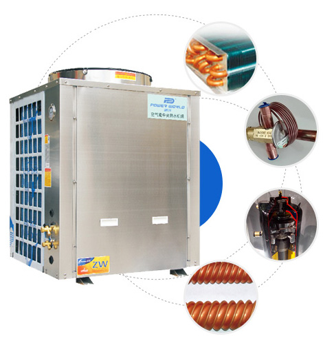 贝博空气能热泵采用先进的工程配套控制系统,可以实现智能控制循环水泵,补水,回水,供水,除霜。