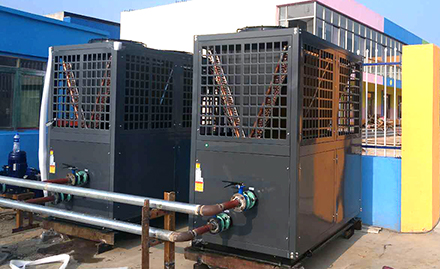 空气源热泵机组由蒸发器、冷凝器、压缩机、膨胀阀四大主要部件构成封闭系统,其内充注有适量的工质。机组运行基本原理依据是逆卡循环原理:液态工质首先在蒸发器内吸收空气中的热量而蒸发形成蒸汽(汽化),汽化潜热即为所回收热量,而后经压缩机压缩成高温高压气体,进入冷凝器内冷凝成液态(液化)把吸收的热量发给需要的加热的水中,液态工质经膨胀阀降压膨胀后重新回到膨胀阀内,吸收热量蒸发而完成一个循环,如此往复,不断吸收低温源的热而输出所加热的水中,直接达到预定温度。