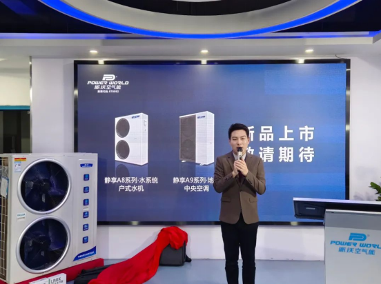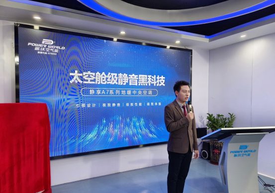 伴随着发布会的开幕,贝博空气能新品——静享A7系列·地暖中央空调震撼亮相,由董事长助理岳总上台主持本次会议,并在现场针对该款新品为大家作出了精彩的讲解。