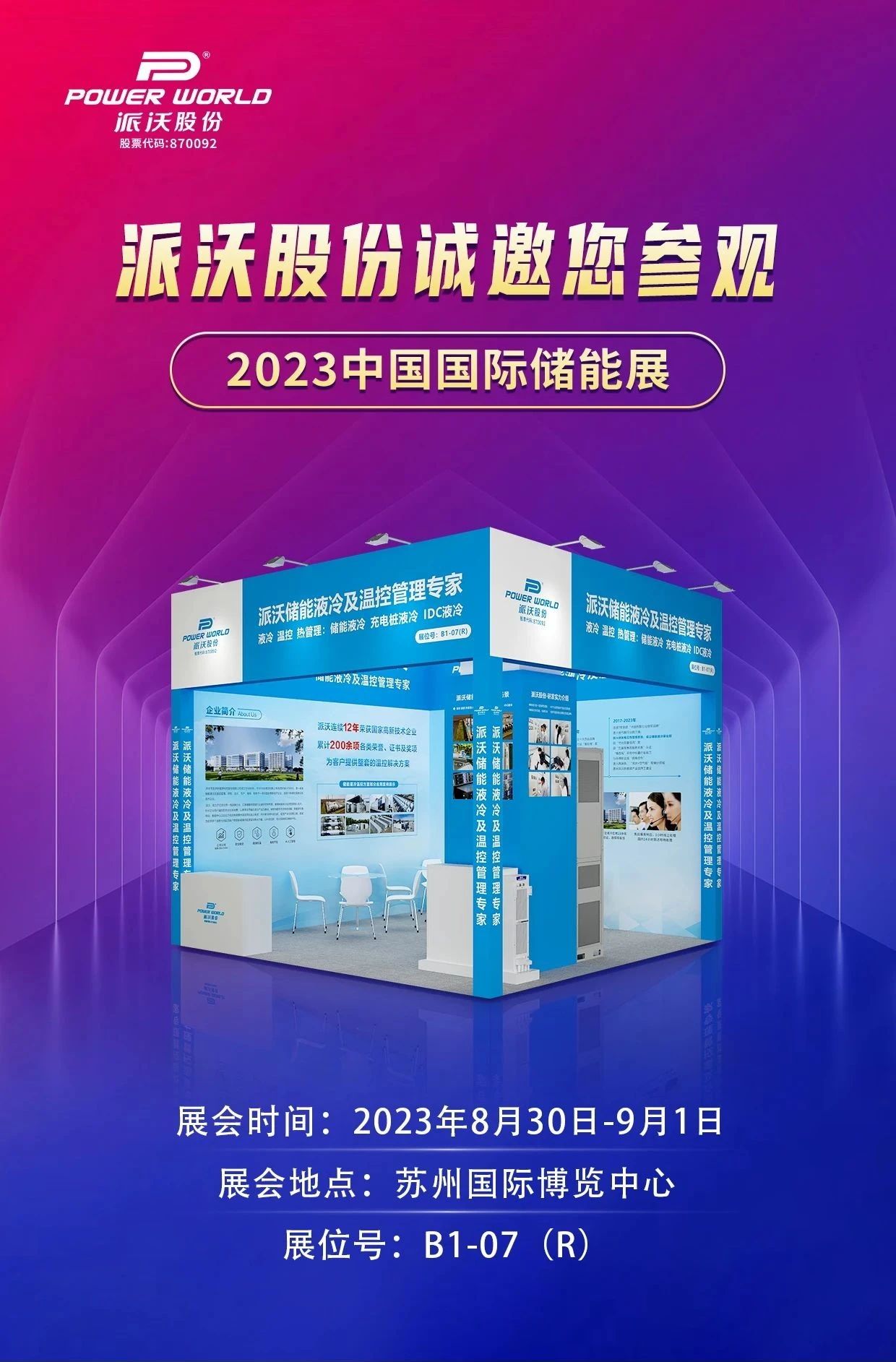 2023年8月30日至9月1日,由EESA储能领跑者联盟主办的第二届中国国际储能展览会将在苏州国际博览中心举办。贝博股份诚挚邀请您莅临B1馆07(R)展位现场交流,与您分享最新的液冷解决方案和技术,共探全球新能源储能发展趋势。