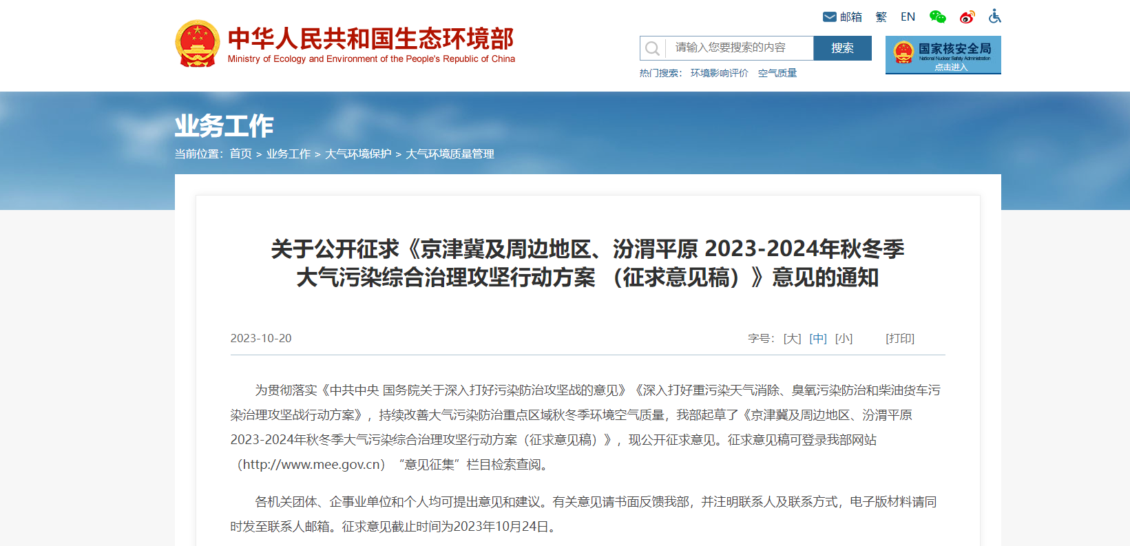 近日,生态环境部关于公开征求《京津冀及周边地区、汾渭平原2023-2024年秋冬季大气污染综合治理攻坚行动方案(征求意见稿)》意见的通知指出,持续开展秋冬季大气污染综合治理攻坚行动。