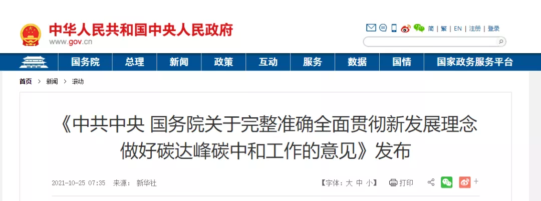 2021年10月24日,中共中央国务院发布《关于完整准确全面贯彻新发展理念做好碳达峰碳中和工作的意见》。