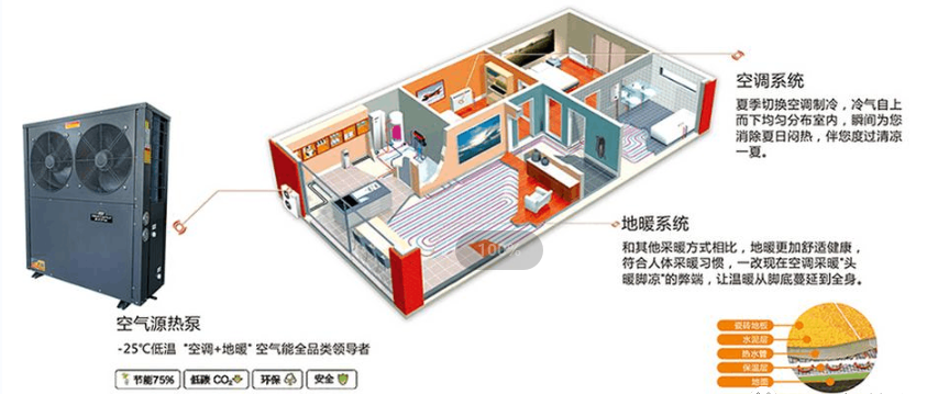 “贝博空气能地暖机组”一机三用,冬天采暖,夏天制冷,热回收用于家庭生活热水,无需采购多种设备,减少初期投资。