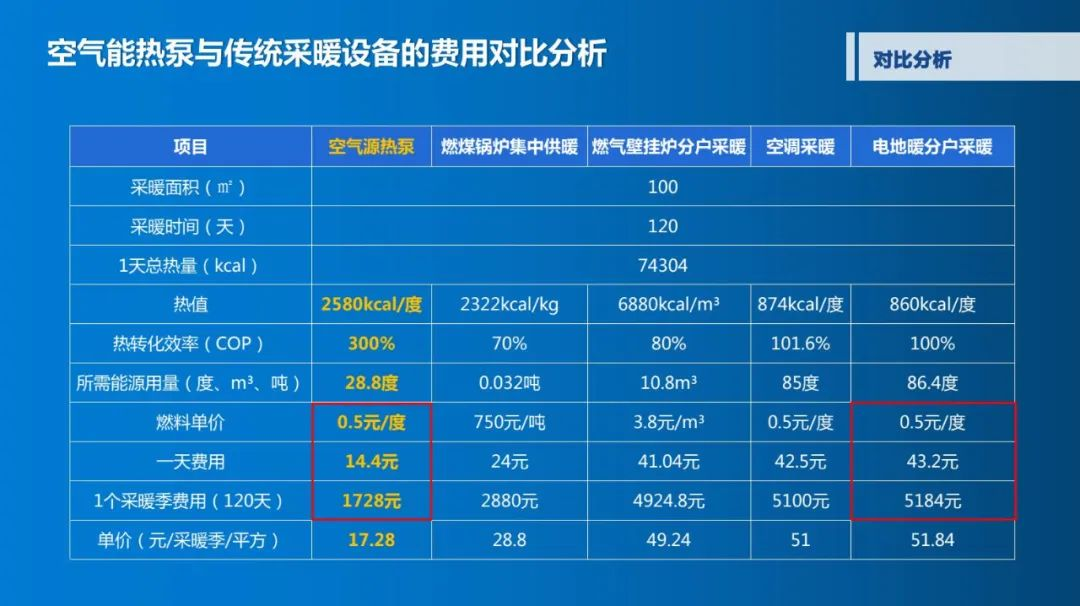 关于电费问题如上图,以北方普通家庭为例,采暖面积为100㎡,一年采暖季为120天,使用电地暖1天需花费约43元,按照0.5元一度电来算,4个月供暖期总费用约5100元,而贝博空气能1天费用约14元,4个月供暖期总费用约1700元。因此,显然使用空气能更节能更省钱。