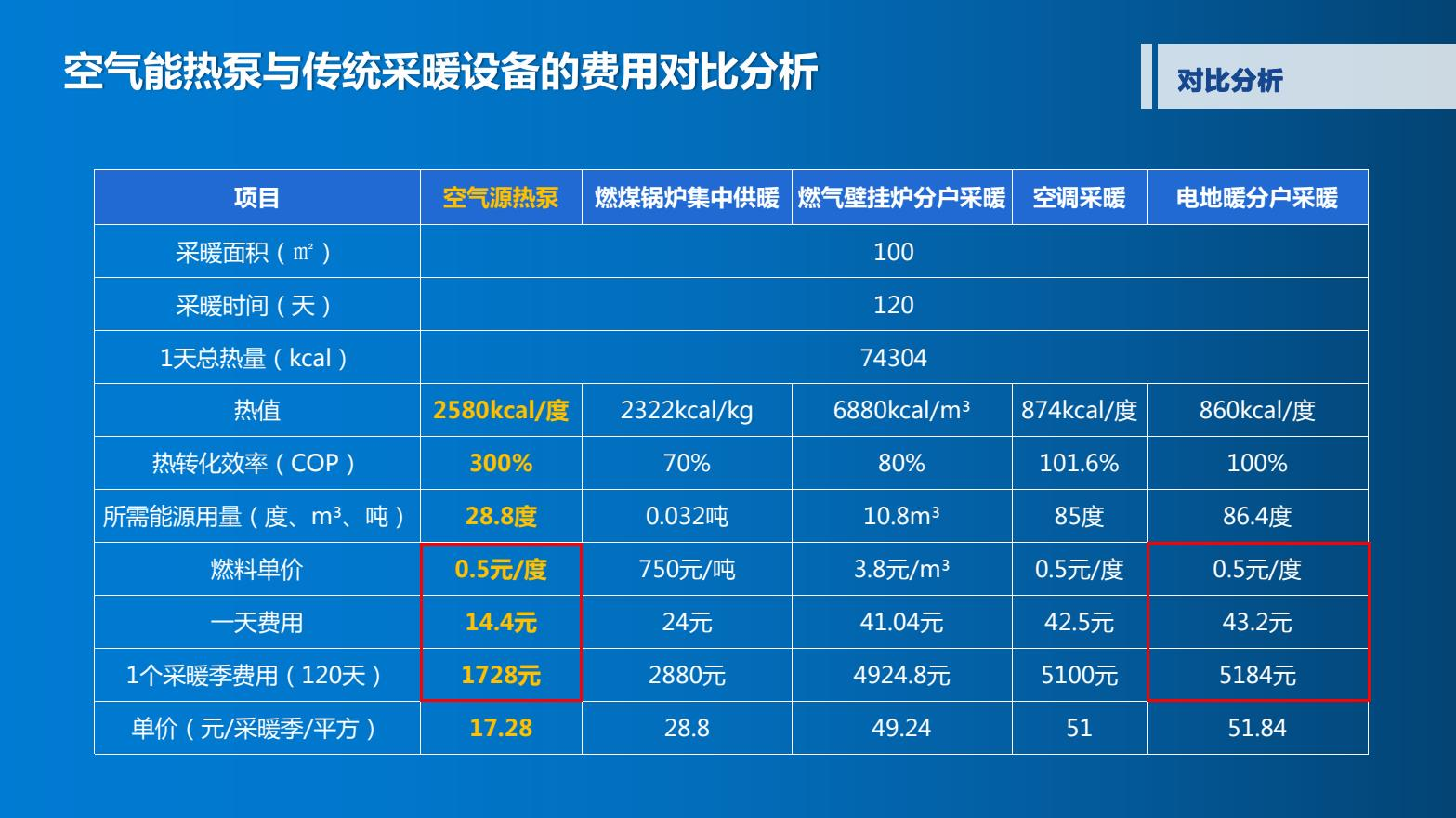 关于电费问题如上图,以北方普通家庭为例,采暖面积为100㎡,一年采暖季为120天,使用电地暖1天需花费约43元,按照0.5元一度电来算,4个月供暖期总费用约5100元,而贝博空气能1天费用约14元,4个月供暖期总费用约1700元,为广大用户带来的最直观的感受是取暖成本的明显下降。