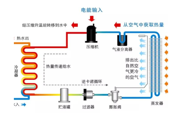 空气能热泵利用逆卡诺原理,以极少的电能,吸收空气中大量的低温热能,通过专用压缩机的压缩变为高温热能,是一种节能高效的热泵技术,无燃烧、无排放,在真正意义上实现了环保节能。