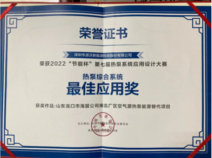 2022年7月27日,荣获2022“节能杯”第七届热泵系统应用设计大赛-最佳应用奖。