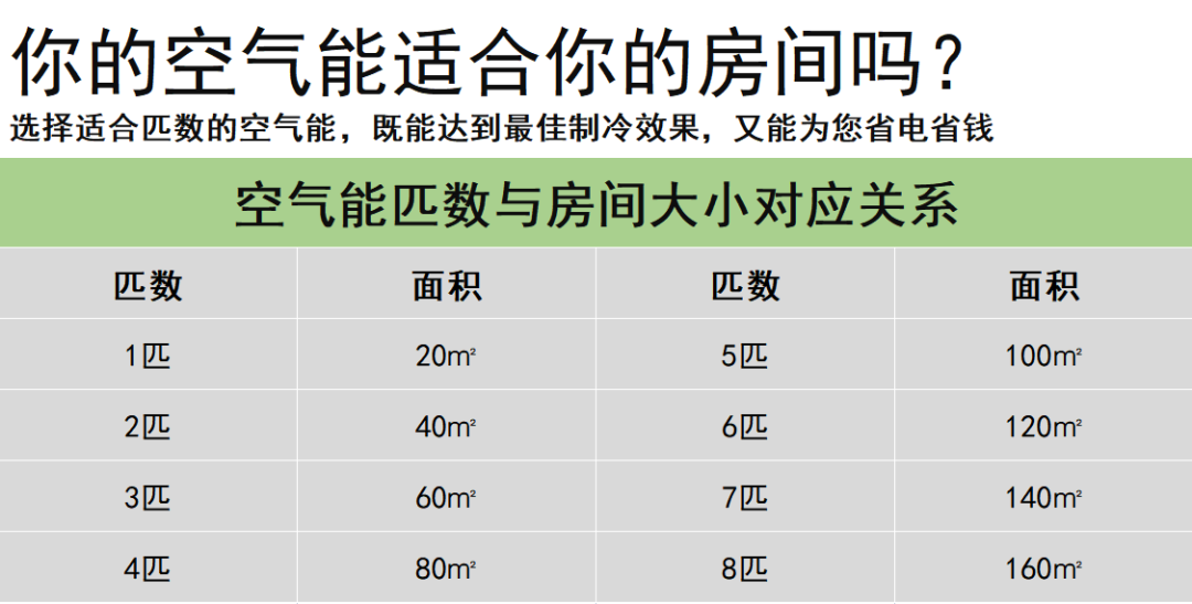 首先,空气能的匹数和房间大小直接相关。匹数过小,无法满足房间的制冷需求,而匹数过大则会浪费能源。一般来说,房间越大,所需的空气能匹数也越大。但是,房间面积只是制冷量计算的一个参数,还需要考虑房间层高、房屋保温情况、窗户玻璃大小、日照方向以及时间等因素的影响,例如房屋存在密封不好、有向阳的大落地窗户以及超高的层高等情况时,单位面积制冷量就需要算大一些,从而保证制冷效果。