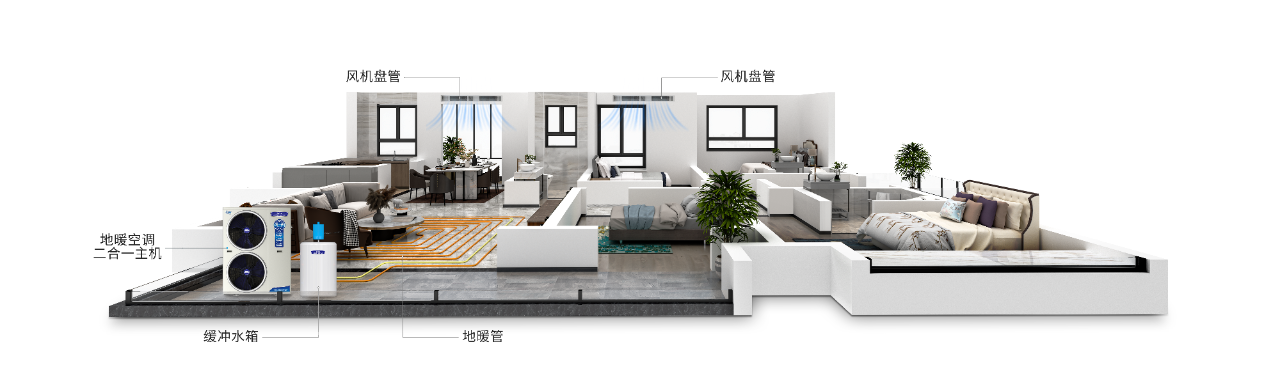 风机盘管与家用空调类似,一般为墙壁挂装、立式明装或吊顶暗装,比明装暖气片节省空间。同时,风机盘管所需的热水温度一般在40-45℃,换热效率高,采暖区域会在较短时间内达到设定温度。若使用空气能热泵二联供机组,就可以替代中央空调,同时拥有制冷+采暖的功能。