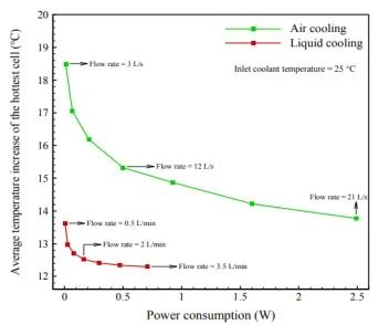 经试验研究,为了达到相同的电池平均温度,风冷需要比液冷高2-3倍的能耗。相同功耗下电池包的最高温度,风冷比液冷要高3-5摄氏度。液冷的功耗更低。